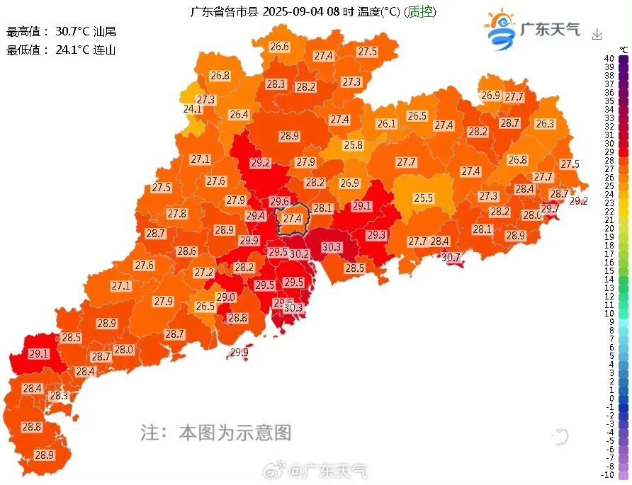 汕尾、番禺、东莞、珠海的气温齐刷刷30℃+